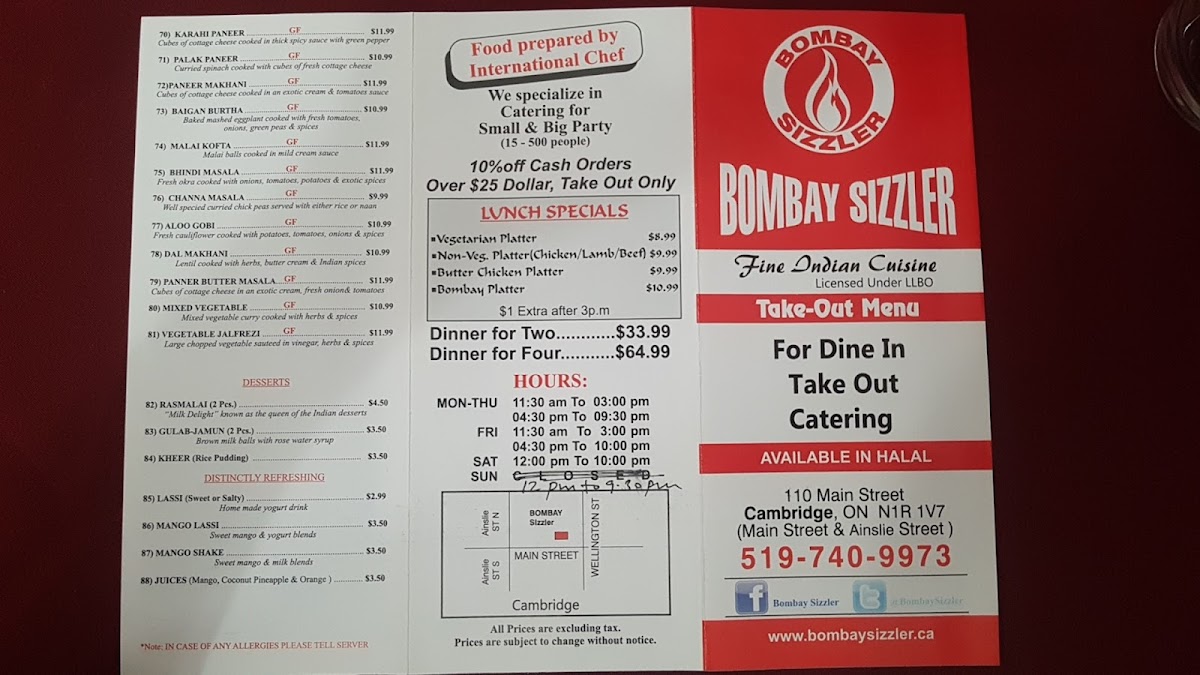 Welcome to Bombay Sizzler, a culinary gem nestled in the heart of Cambridge, Ontario. This charming Indian restaurant, located at 110 Main St, Cambridge, ON N1R 1V7, has been delighting locals and visitors alike for over thirteen years. With its inviting atmosphere and a menu brimming with authentic flavors, Bombay Sizzler is your go-to destination for an unforgettable Indian dining experience.